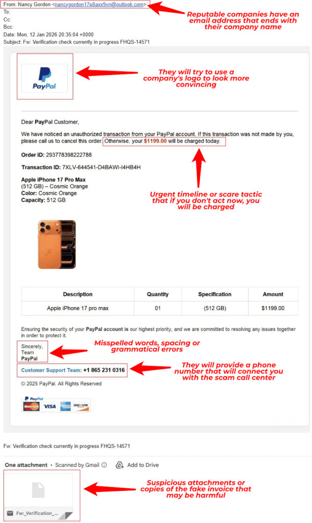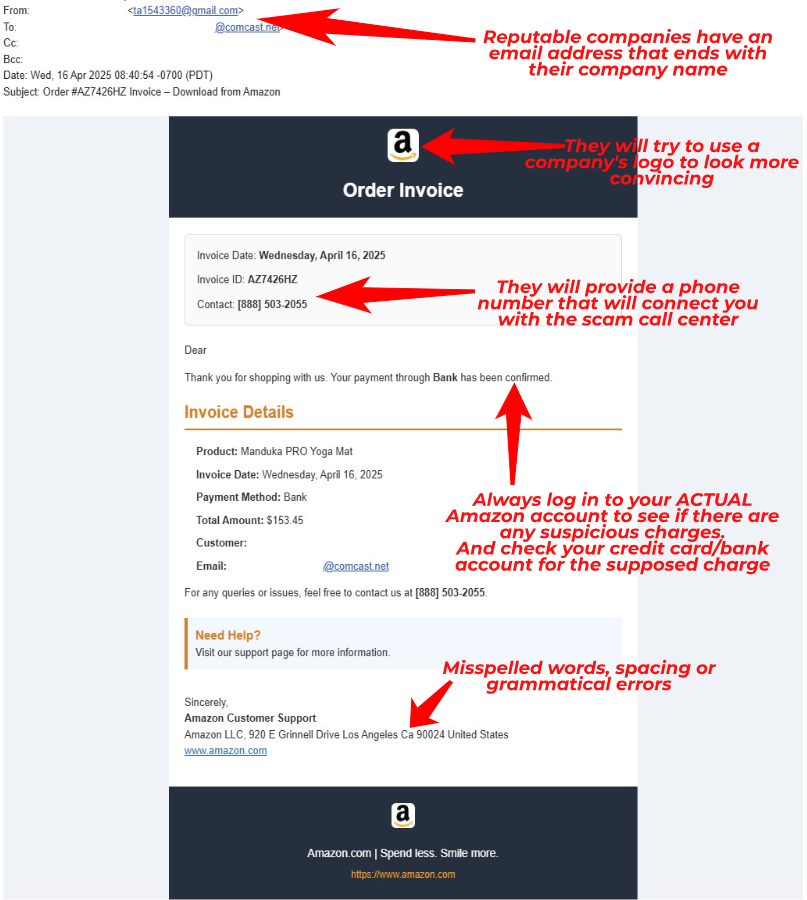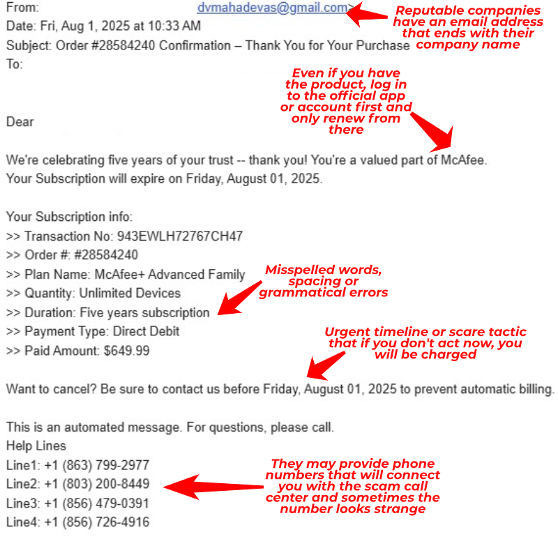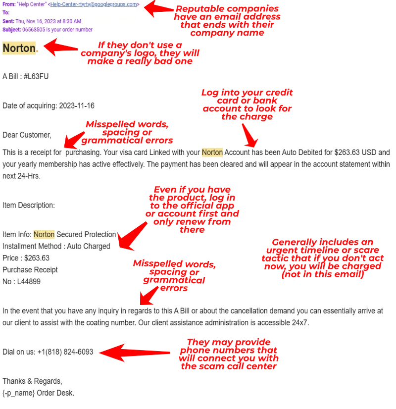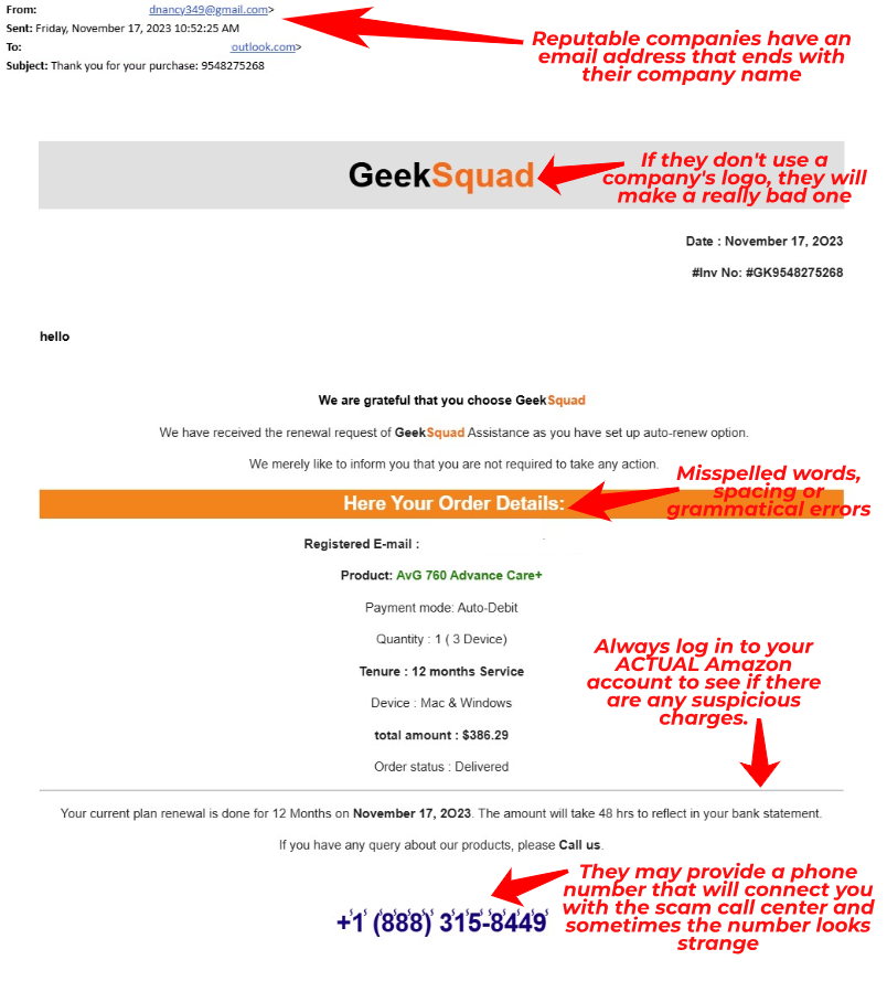 One of the most important things to remember about these scam emails, text messages, or images is that no matter how professional they look, your best bet is always to log into your account first to see if there are really any suspicious charges. You can usually dispute any unauthorized charges through the app or account itself. Most of these companies do not have a customer support number for you to call, and if they do, they will include that information directly on their official website or in the app itself. DO NOT ever call the numbers on these fake invoices because you will be connected to an overseas scam call center. They will trick you into downloading remote access software to your device or computer. Oftentimes, especially on a computer, these programs can be very difficult to remove. We recommend you disconnect your internet router to ensure that device is disconnected from the internet (including disconnecting Wi-Fi) until those remote access programs are removed. Once removed and secure, you can plug your router back in and turn your Wi-Fi back on. Take your computer in to a local computer repair shop to have it serviced if in doubt. Please also ensure that you have changed your banking and other personal accounts passwords immediately. Below is a list of several of these scam emails, please click on the one you’ve encountered and learn what to look out for so that this doesn’t happen again.